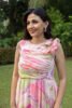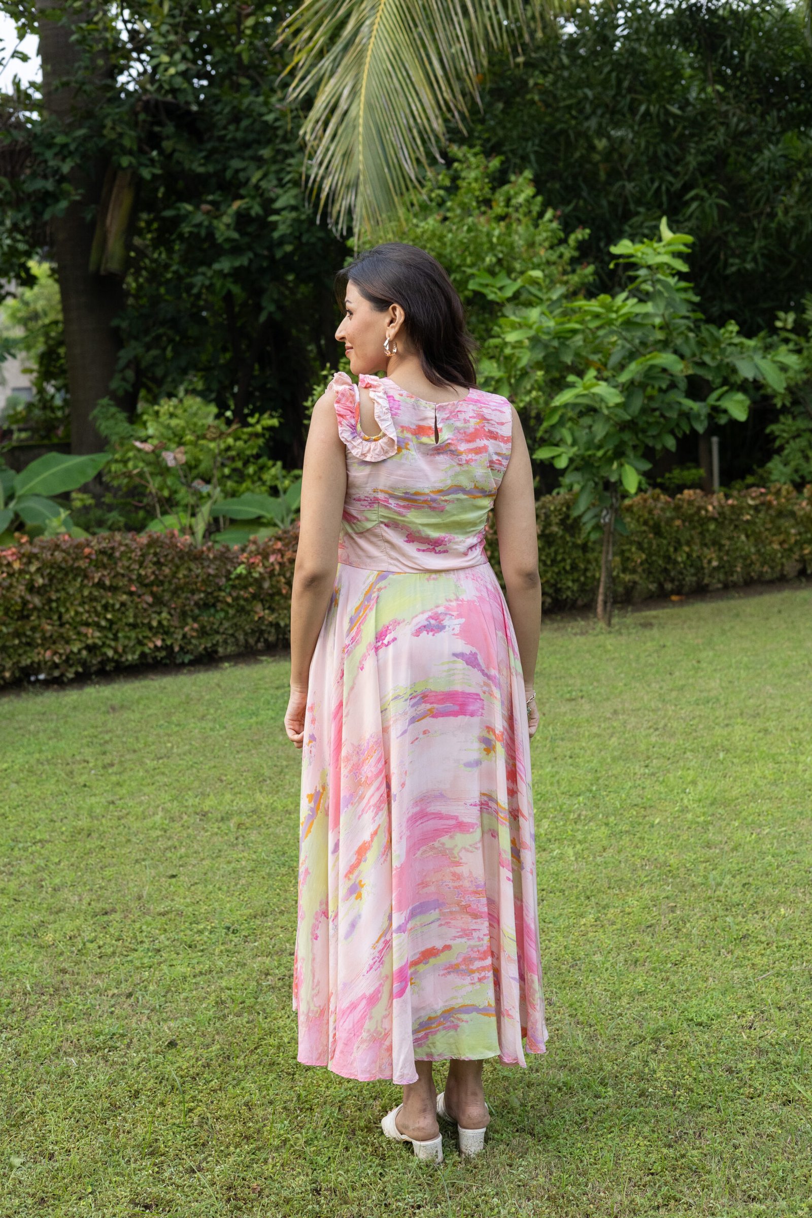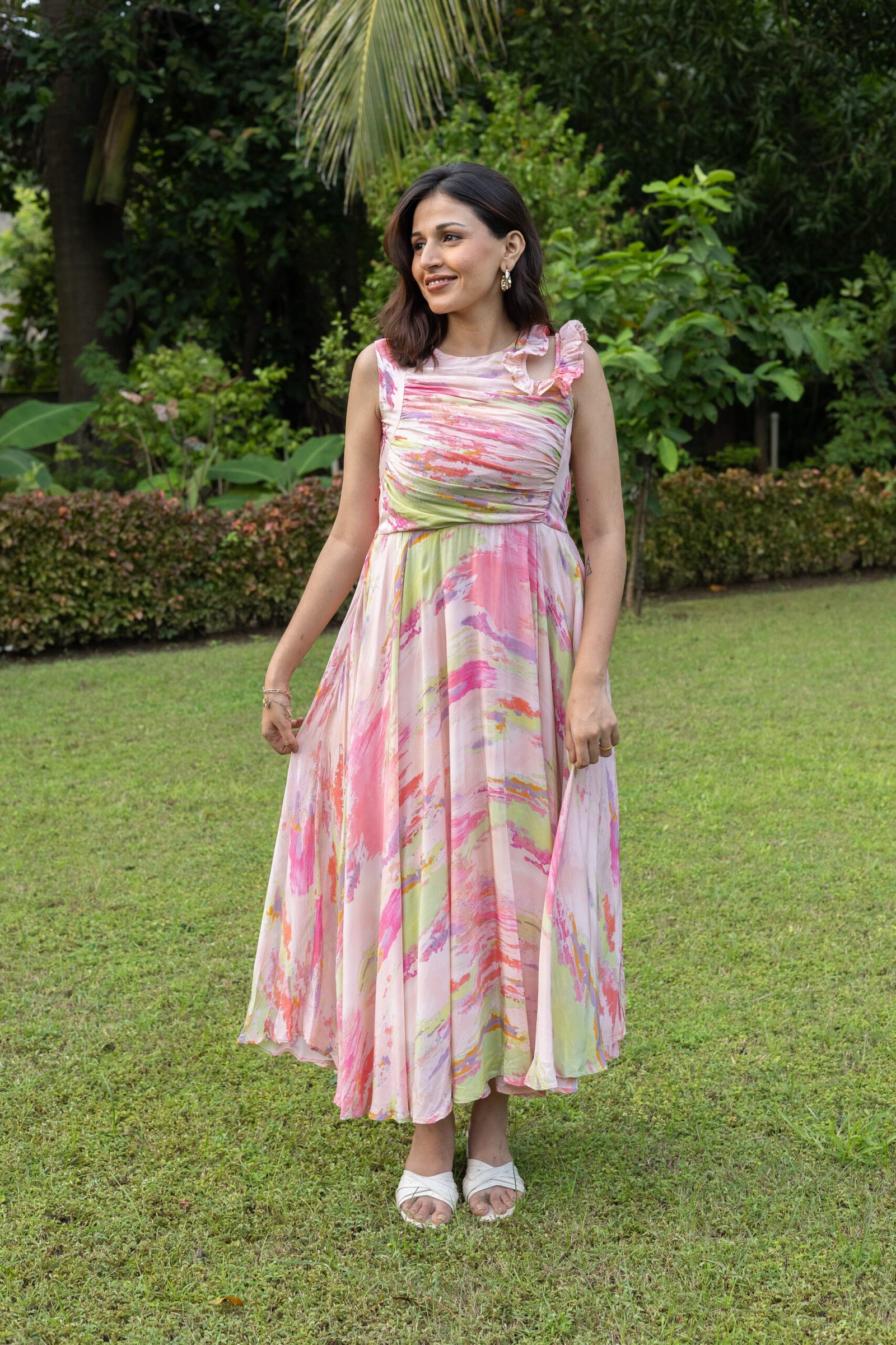 This dress features a mesmerizing watercolor swirl print in vibrant pinks and greens. The ruched, fitted bodice and delicate shoulder ruffles flow into a graceful A-line midi skirt, creating a perfectly balanced and feminine silhouette. It’s the ultimate choice for elevated summer style.