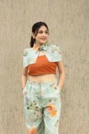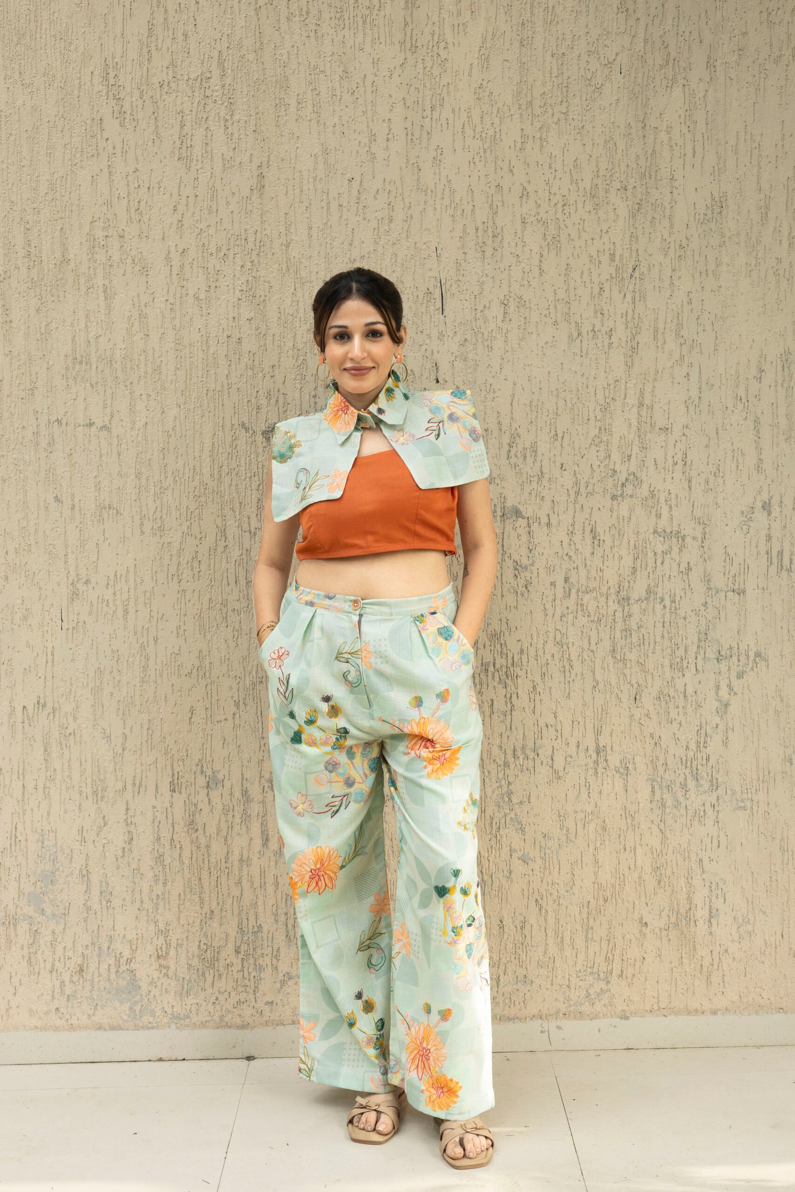 It pairs high-waisted, printed trousers with a vibrant rustorange crop top and a striking, matching printed capelet. The structured collar and shoulder detailing on the capelet, combined with the artistic Doodle print on the mint base, make this ensemble an absolute showstopper.
