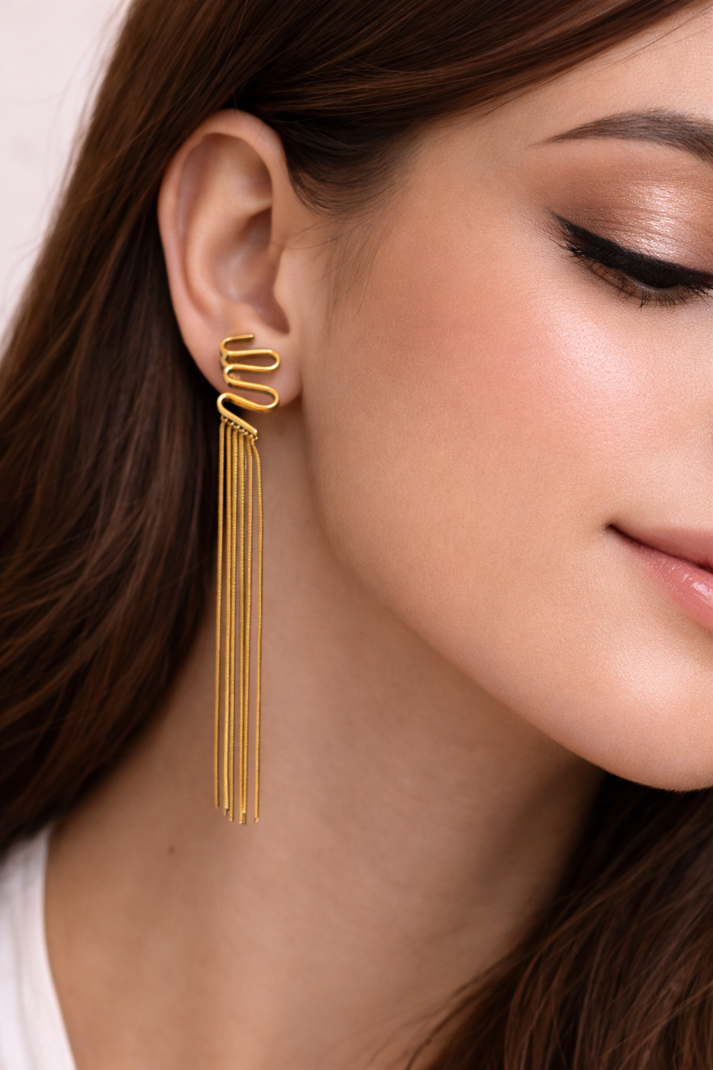 Sculpted wave studs paired with fluid chain tassels for dramatic movement.