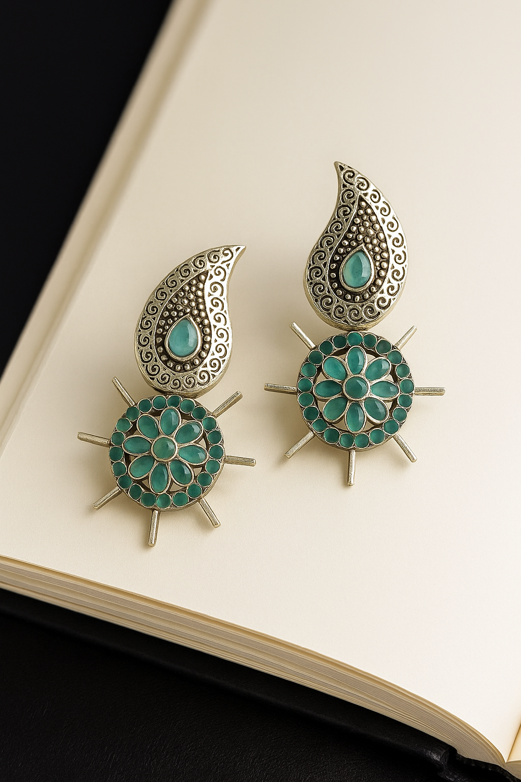 These artistic earrings feature intricate paisley tops with turquoise accents and sunburst floral motifs, blending vintage charm with a bold contemporary flair.